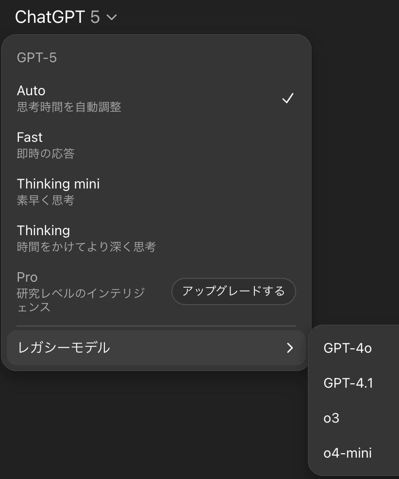 ※なお、ChatGPTの設定画面で「レガシーモデルを表示」をオンにすると、Thinking MiniモードやGPT-4oなど旧モデルもメニューに表示できるようになります。プラス/プロプランの方で興味があれば試してみてください。